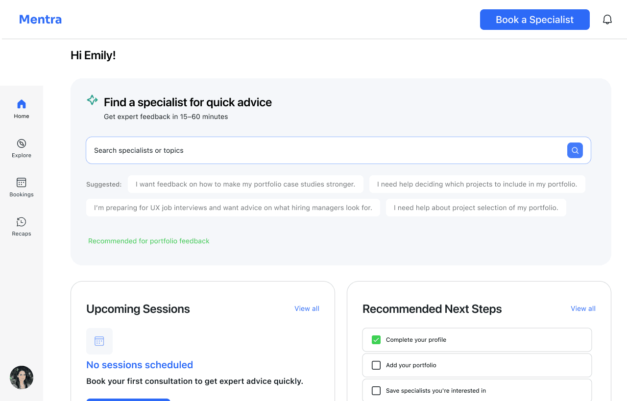 Systematic CTA Hierarchy: Global "Book session" CTA was contextually confusing on the home screen before any specialist was chosen
