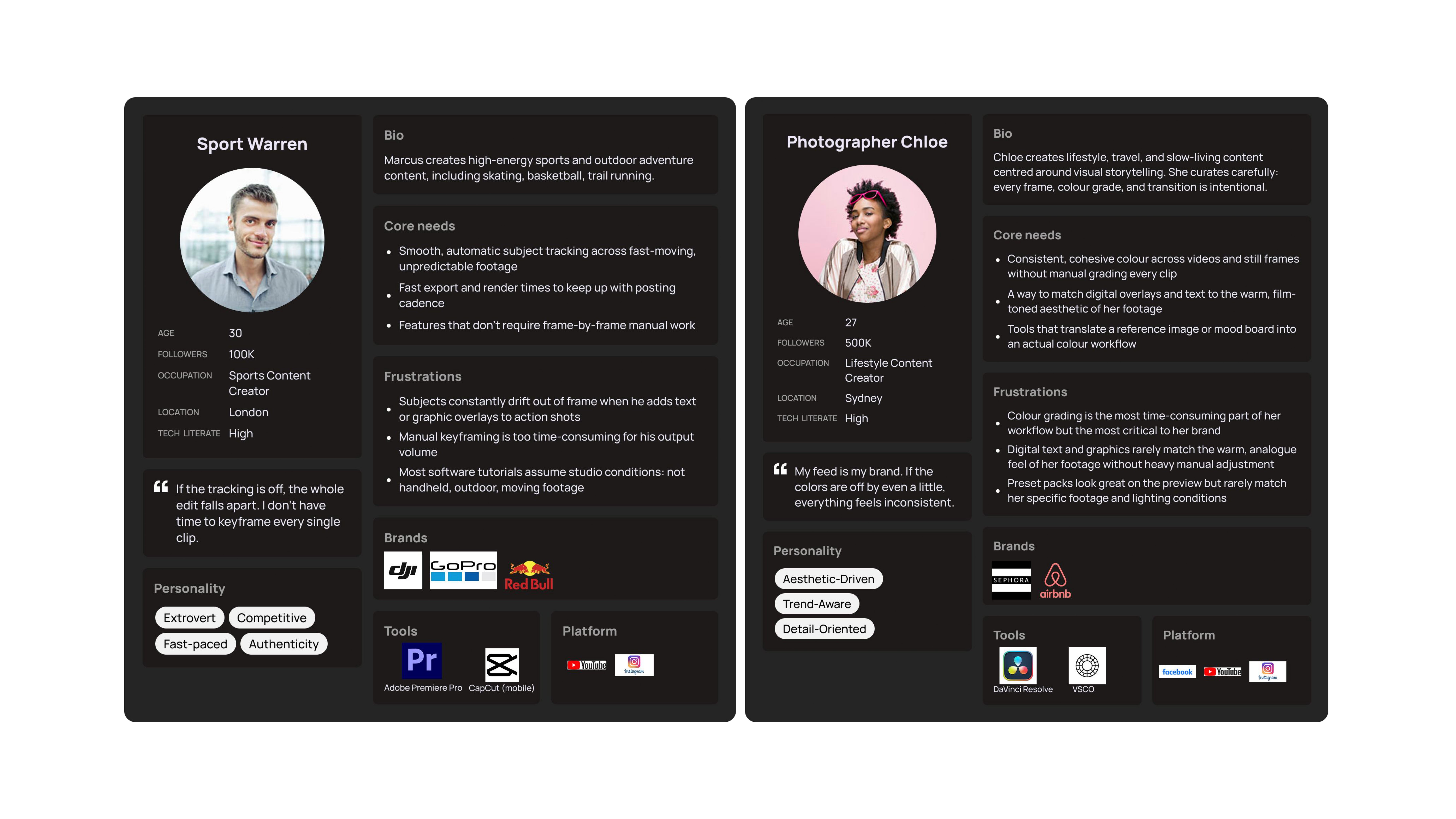 For Sport creators: AI Planar Tracking; their pain point is that subjects drift out of frame in fast-moving footage.