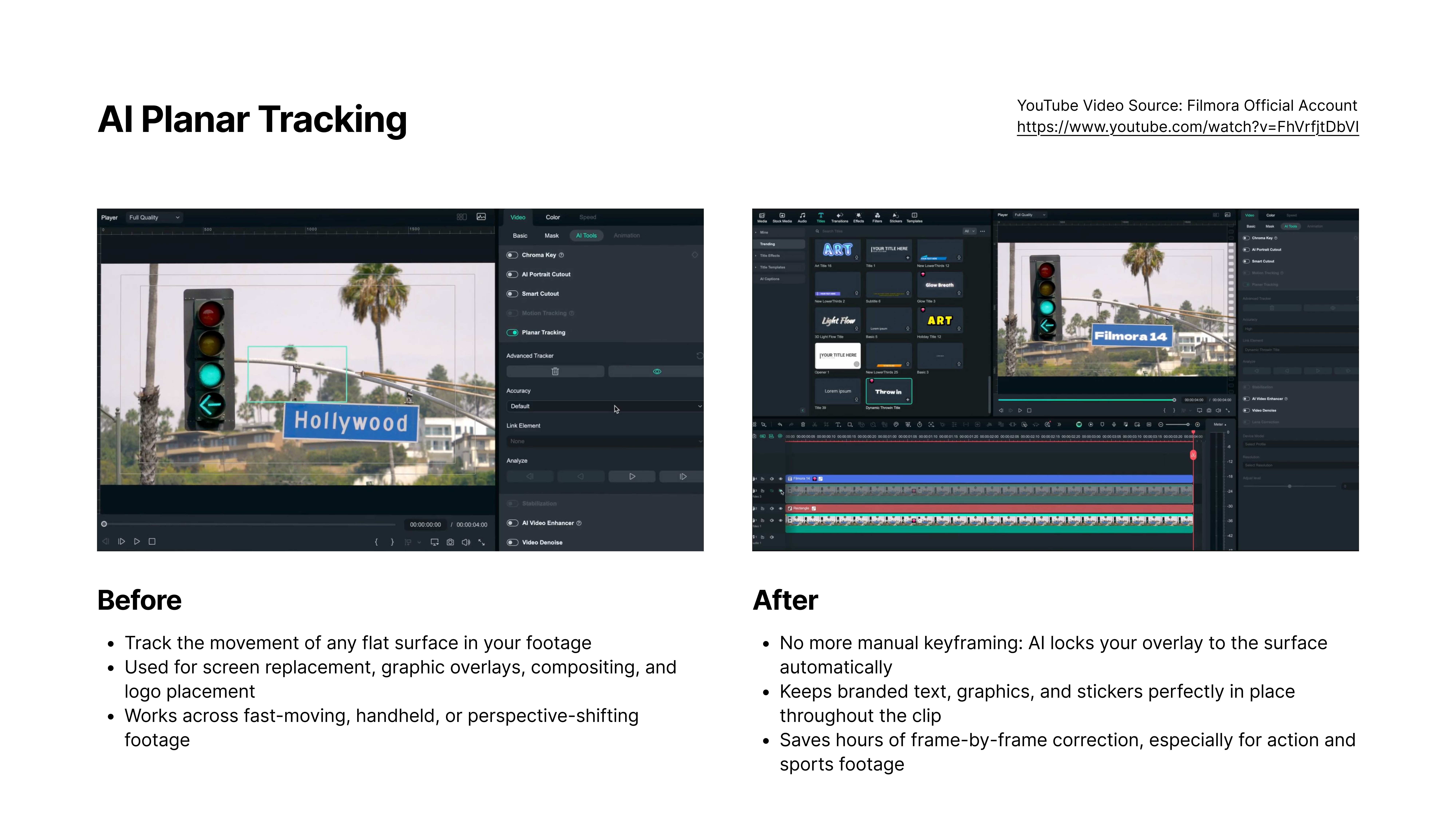 AI Planar Tracking: automatically tracks and locks overlays onto moving surfaces in dynamic footage