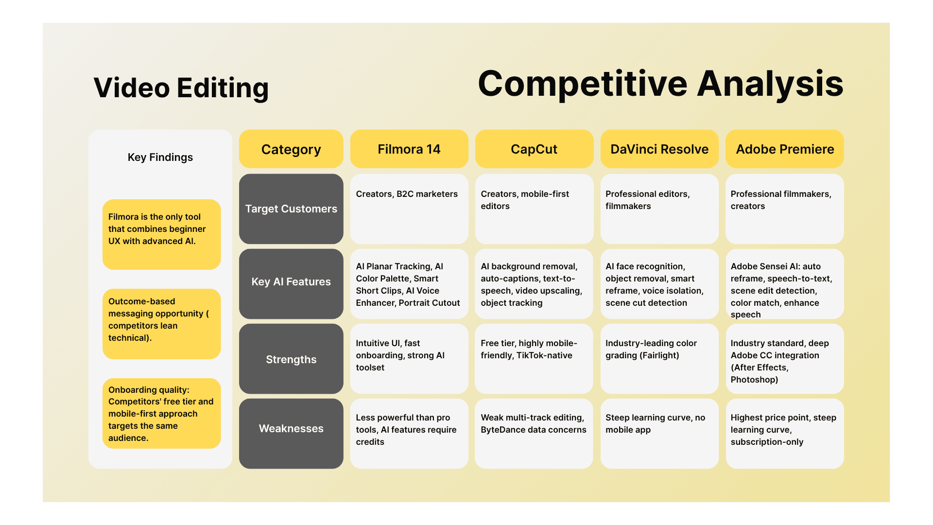 Takeaway: Unlike top-down market research, this project brought bottom-up evidence into the decision-making process. Combining behavioral observation, qualitative interviews, and competitive benchmarking built a connected story: from creator pain points, to feature design, to launch strategy, ensuring Filmora 14 shipped with confidence, not assumptions.